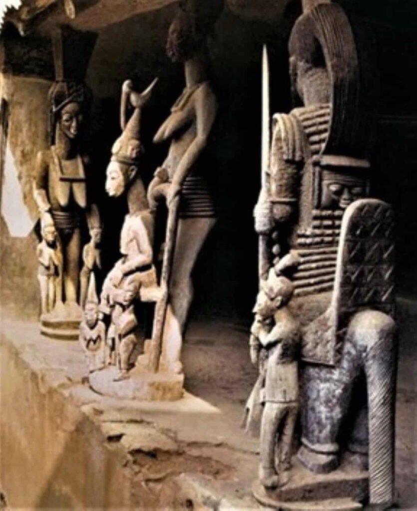 264 a: Veranda del palacio de Ogaga en Ikere. b: Detalle de la pieza central en la que Olowe recreó la entronización del rey Arnolfini por su ‘primera esposa’, con su adenla y atributos, ambientando la escena en época de la IV dinastía. En la que Arnolfini toma el carácter del faraón egipcio Micerino o Menkaura y a su mujercon los tocados de la mismísimo Nefertiti Akhenaton, idealizando a sus pies a sus tres hijas. Trabajo que terminó en 1938.