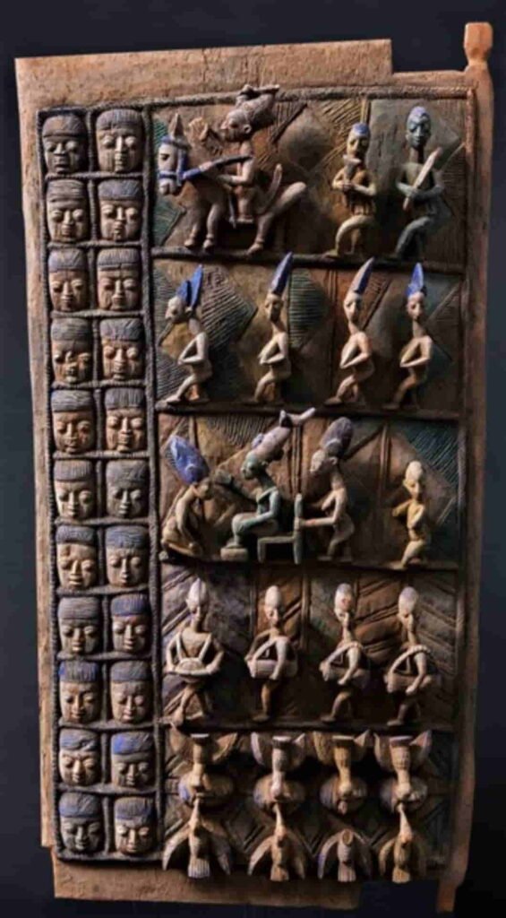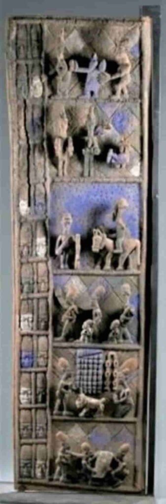 - 267: Claramente alusiva a Eshu, cuyas multiples facetas se ven a la izquierda a lo largo de la puerta. Arriba encabeza una comitiva el rey, con su adenla en la que destaca el pájaro. Le siguen los músicos rituales y ya abajo la reina, véase su peinado, y el resto de esposas en su tradicional gesto de sujetarse los senos, las dos del final, muestran su juventud y belleza enseñando sus dientes. El relato continua mostrando al rey hablando con su esposa, atendido por otra, mientras corretea un niño. Prosiguen los tamborilelos rituales encabezados por el parlante o idakka. Termina esta clara connotación mística con las recurrentes cabezas cuyos ojos picotean los pajaros.