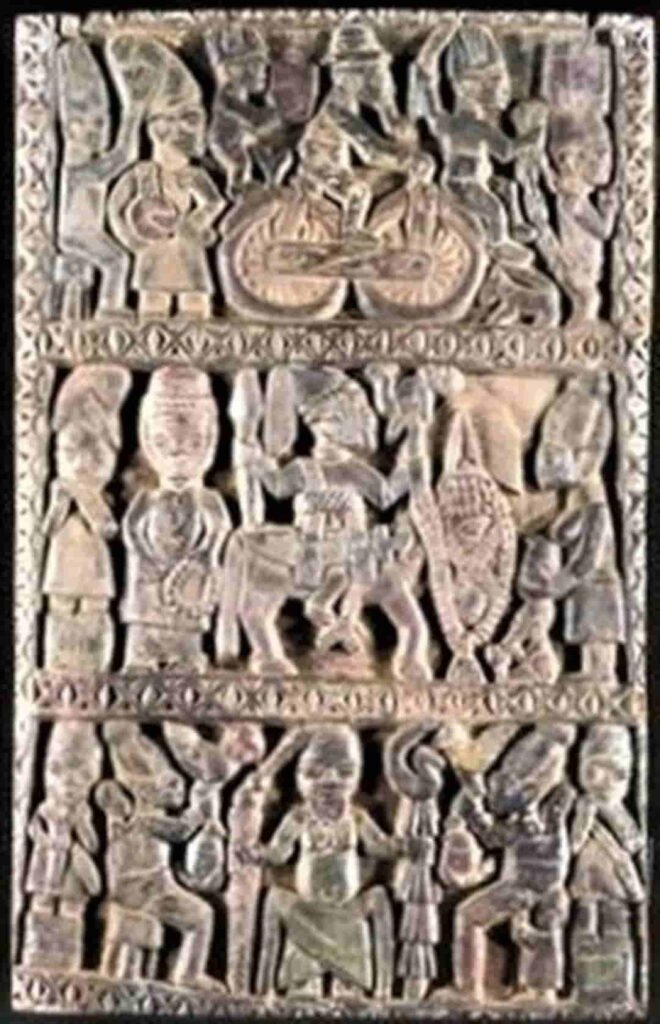En el 2º el rey, tal vez otro pues lleva distinta adenla o corona, se puede ‘leer’ de derecha a izquierda y de arriba hacia abajo, que con los correajes cruzados de combate habla con su reina mientras toca un músico, debajo la reina muele grano junto a otra esposa; a la derecha tres tamborileros tañen sus instrumentos mientras otres tres personajes armados se situan por debajo. En el 3º el rey a caballo observa cómo su mujer le presenta a un niño, músicos , instructores y mujeres participan en la escena; a la derecha, un rey parecido al primero, parece observar mientras un individuo debajo lleva una carga que bien podría ser un niño.