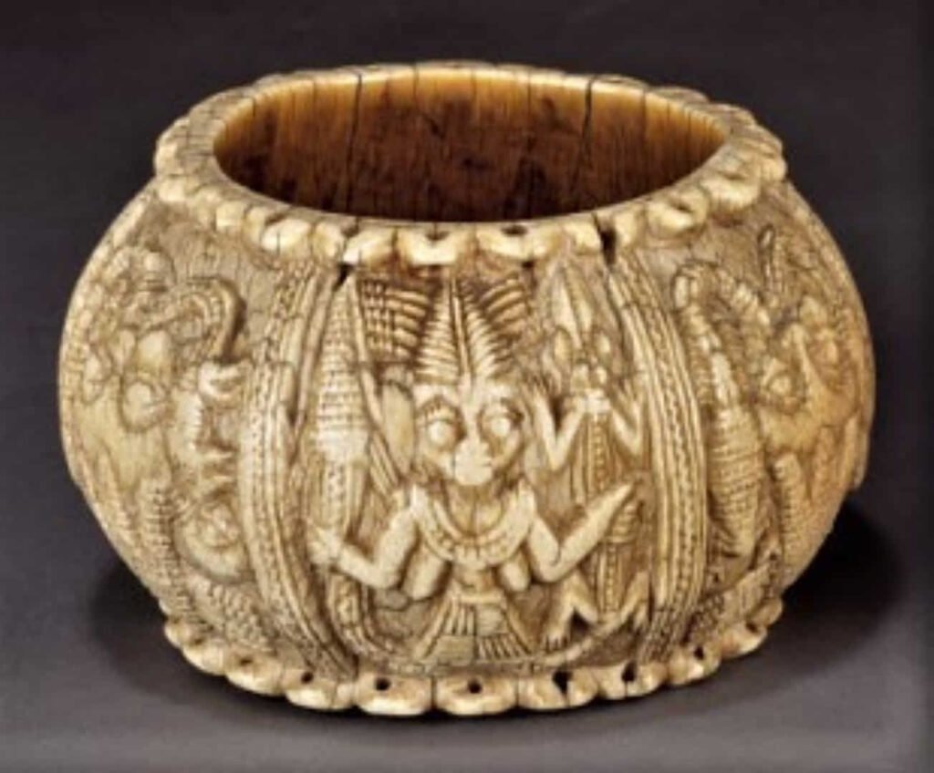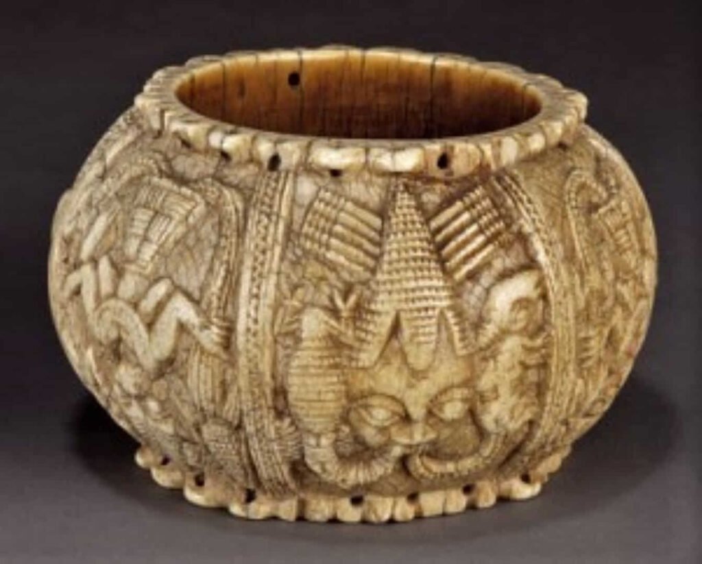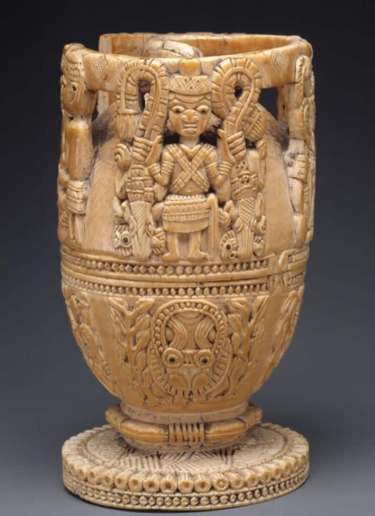 “Este espectacular recipiente de marfil fue una vez la posesión atesorada de un olowo, el gobernante del reino yoruba de Owo en el actual sur de Nigeria. Owo saltó a la fama regional en el siglo XVIII a través del comercio y la conquista, y se convirtió en uno de los estados más grandes de África occidental en ese momento. Tenía estrechos lazos políticos con el reino de Benin, a unas setenta millas al sureste. Gran parte de la cultura cortesana de Owo, incluidos títulos, disfraces y esculturas de prestigio, reflejan una estrecha asociación entre los dos importantes centros políticos y culturales.