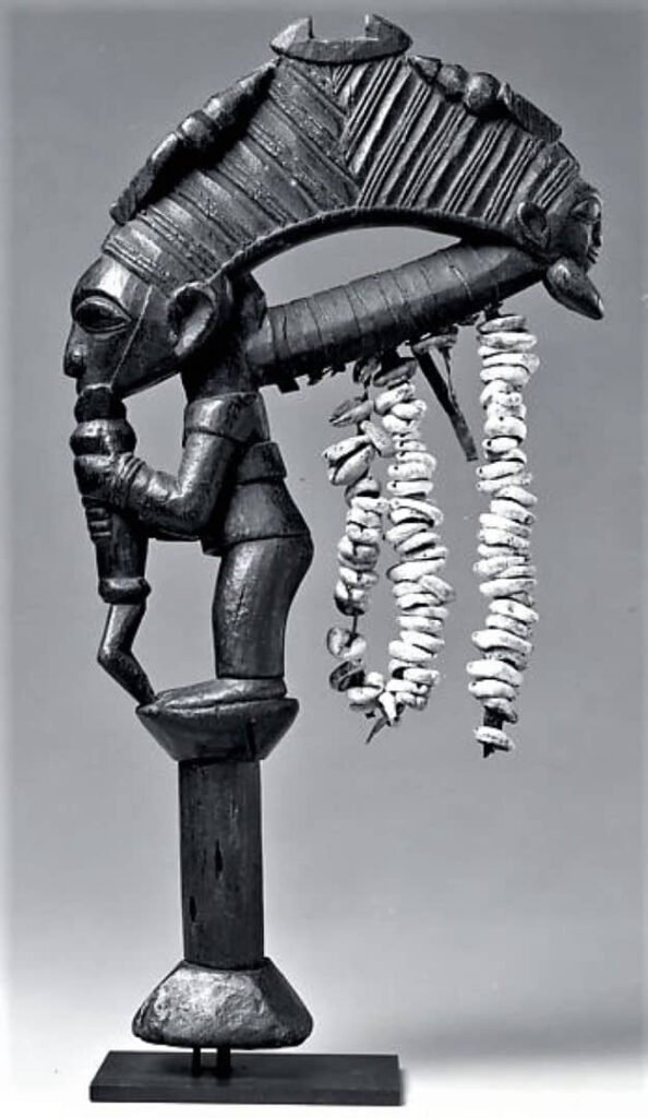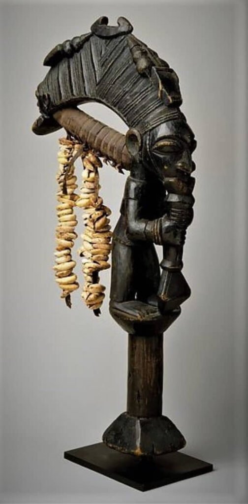 151 a y b Bamgboye of Odo Owa ca. 1893–1978. Datado en siglo XX. Pueblo yoruba de Odo Owa, Ekiti, Nigeria. Madera, caurís.Medidas: 41.9 x 6.7 x 21.6 cm. Donación de Martin L. Schulman, M.D., en 1981, al MetMuseum, Metropolitan Museum of Art. Nº rg: 1981.422.1