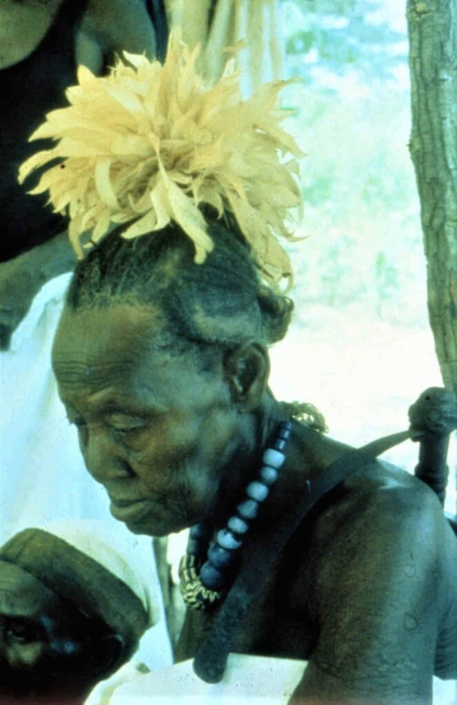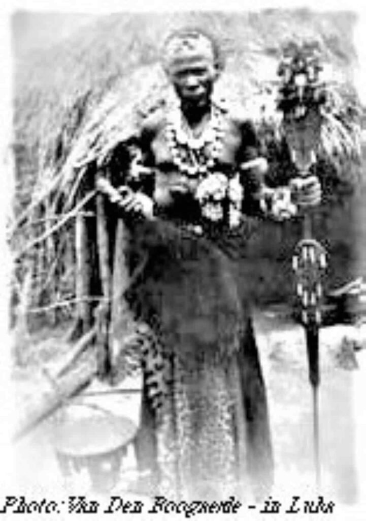 - f .- Vemos en esta foto de Thomas Q. Reefe de alrededor de 1970, recuperada por Mary Nooter Roberts, a una mujer que resultaba ser la encarnación del Rey Kasongo Niembo, muerto en 1933, al residir en ella el espíritu Mwadi. Vemos sobre su hombro izquierdo una Kibiki que al haber sido propiedad de dicho rey, ella tiene que llevar.