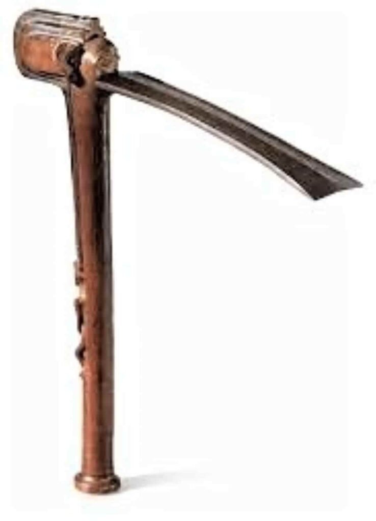Y el sólido mango de dura y consistente madera con el que ya se podría abrir una cabeza, ergonómicamente adaptado para que soporte tensión y presión, adornado además con una banda de cobre, que raro y por ello caro, habla de opulencia y comercio, pues mío es el territorio al sur del Zambeze donde se produce. Exhibida en el Metropolitan.