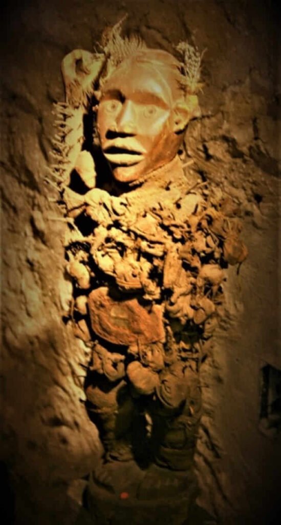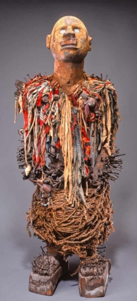 Sobre la figura, sea n’kisi, ‘fetiche’, o n’kisi n’kondi, ‘fetiche que sale a cazar’, se da cabida a colocar objetos variopintos según cada función: