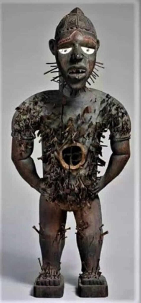 – En los más antiguos veremos insertadas lascas metálicas, y clavos en los más modernos, siempre de procedencia europea u americana pues su hierro tiene un carácter sagrado relacionado exclusivamente con los ancestros o los linajes. El proceso, ritual, de introducción de los clavos o hierros en el fetiche, es conocido como, Koma Nloko, ‘clavar la maldición’ o Nkomono, ‘invocar solución’.