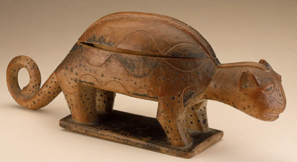 Esta caja yoruba posiblemente se utilizaba para ofrecer nueces de cola en un santuario o a los invitados distinguidos. Esta simbiosis, era un típico símbolo religioso en Ijebu, que explicaba el concepto de transformación al combinar las manchas del leopardo con las fauces del cocodrilo. Ambos animales son peligrosos y gobiernan dos mundos tan diversos como distantes, el bosque y elrío. Apropiados para representar el estatus de su dueño.