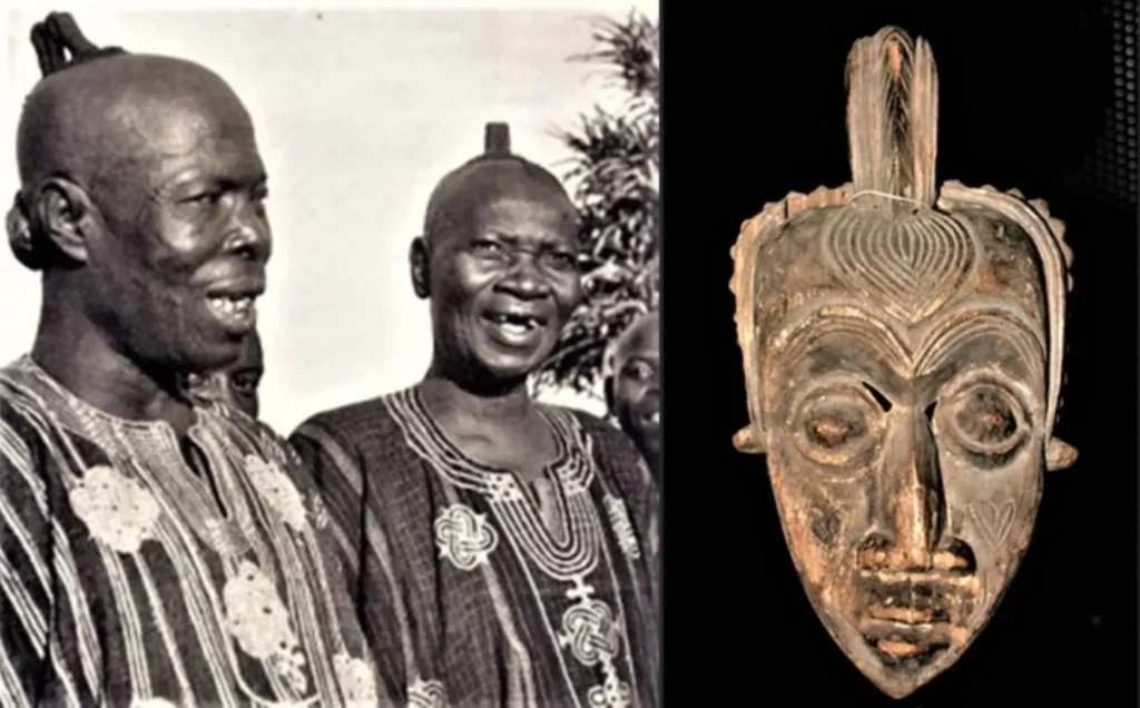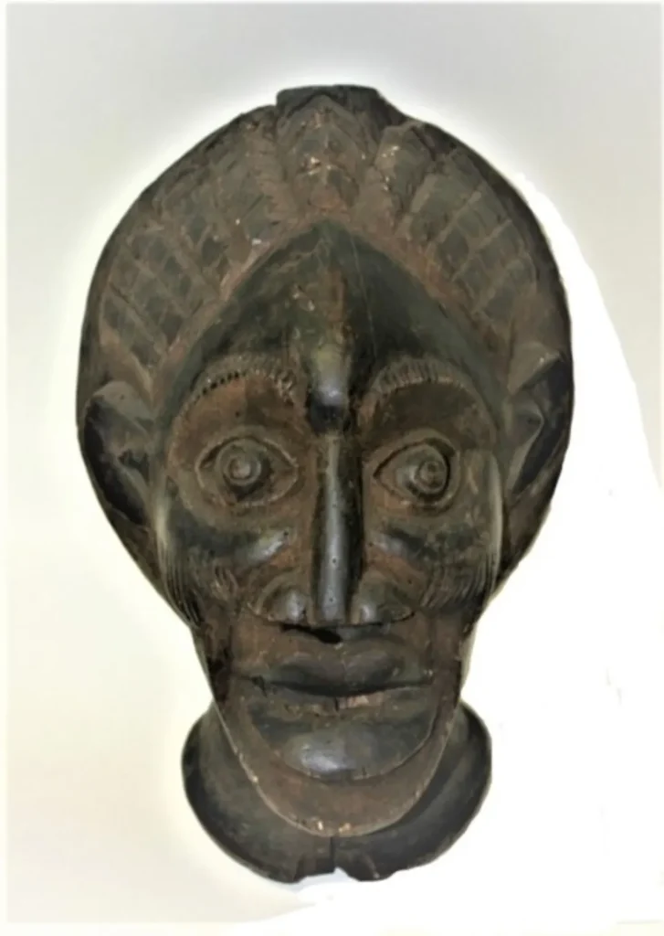 En la máscara, de madera, vemos el mismo moño-coleta, la escarificación de alta dignidad en la frente , las de ‘bigotes de gato’ de las que hablamos anteriormente y la especie de diadema que remata las sienes delante de las orejas como vimos en las cabezas Ifé. Esta máscara, del siglo XIX, representaba a un alto funcionario durante el festival Epa y estaba presente en funerales de personajes de relevancia.