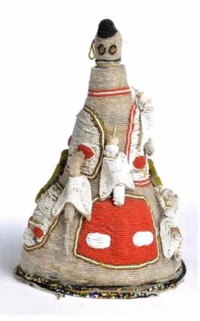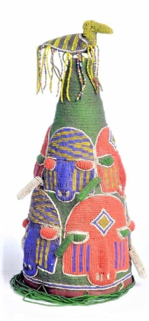 Estos tres tocados Yoruba de cuentas blancas, son ‘coronas’ yoruba que aluden a Olabufon y que solo sus descendientes usan de este color. Si recordamos la simbología de los pájaros y la del color blanco, ambas cosas tienen que ver con la sabiduría. Pertenecen a colecciones privadas norteamericanas.